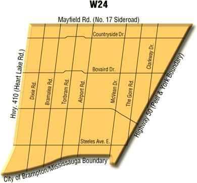 by Highway 410 / Heart Lake Road in the East, Mayfield Road in the